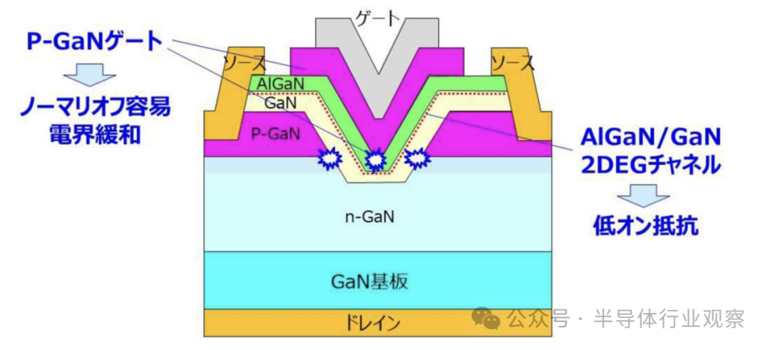 p-GaN栅(Gate)结构的垂直型JFET特点如下,通过将栅(Gate)周边调整为p-GaN/AlGaN/GaN,使常关闭(Normally-off)和低ON阻值成为了可能(下图4)。电流流经路径的一部分会形成与HEMT通道(Chanel)类似的二维电子气(2D EG)。因此,易于降低ON阻值,更适用于高速工作。通过将此类垂直型JFET应用于高频开关电源线路、电机驱动线路,不仅有利于提升功率,有利于实现电路中零部件的小型化(如线圈等)。此外,还可以利用栅部分的p-GaN来减轻电流阻挡层端部的电场,以降低电流的泄露。