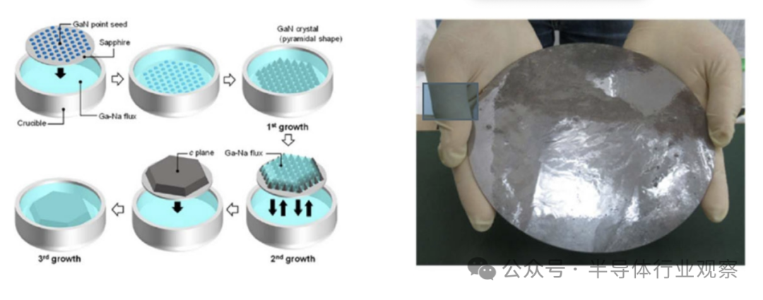 图1:结合Na助熔剂法和多点引晶法制造大直径、高质量的GaN籽晶(左)工艺概念图,(右)制造的6英寸GaN籽晶
