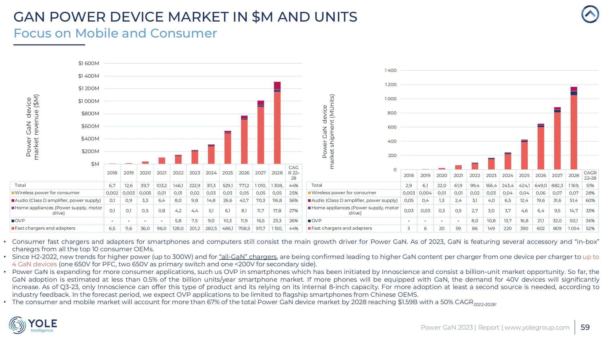 1、在消费者和移动市场中,Power GaN技术正引领快速充电器和适配器的创新潮流,推动市场前行,同时智能手机中的过压保护(OVP)单元及家用电器的应用为其带来新增长点。预计到2028年,这一市场部分将占总功率GaN设备市场的64%以上,达到13亿美元,显示出2022年至2028年间44%的复合年增长率。快速充电器和适配器的创新,如高功率(高达300 W)和“全GaN”充电器,正推动这一市场的增长。