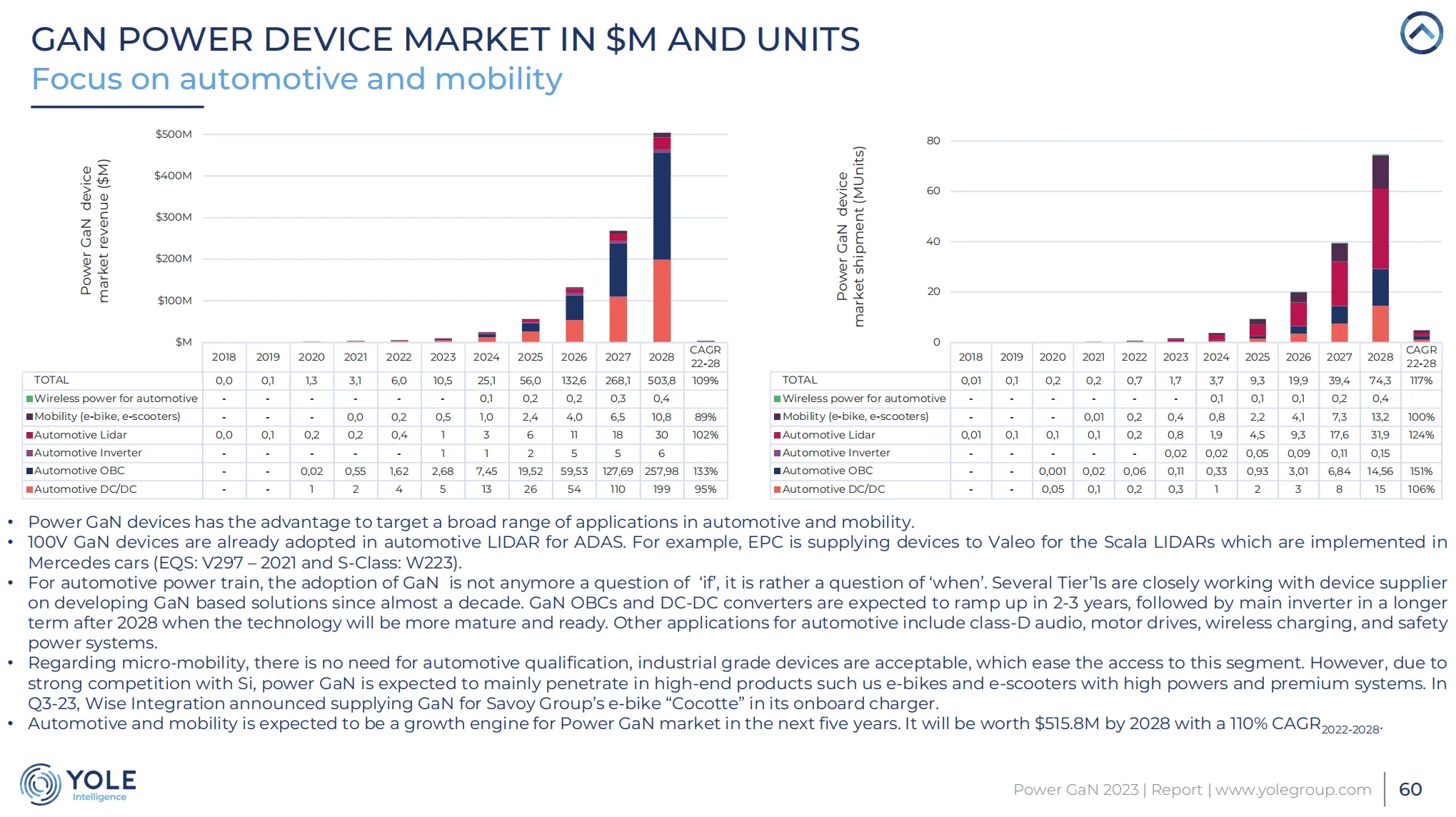 2、在汽车和移动性市场中,GaN设备的应用已扩展到汽车激光雷达(LIDAR),且其在汽车动力总成的采用正蓄势待发,预计GaN OBCs和DC-DC转换器将在未来几年内迅速增长,预计到2028年,市场价值将达到5.04亿美元,显示出2022年至2028年间110%的复合年增长率。这一增长受到汽车激光雷达(LIDAR)、车载充电器(OBC)和DC-DC转换器等应用的推动。