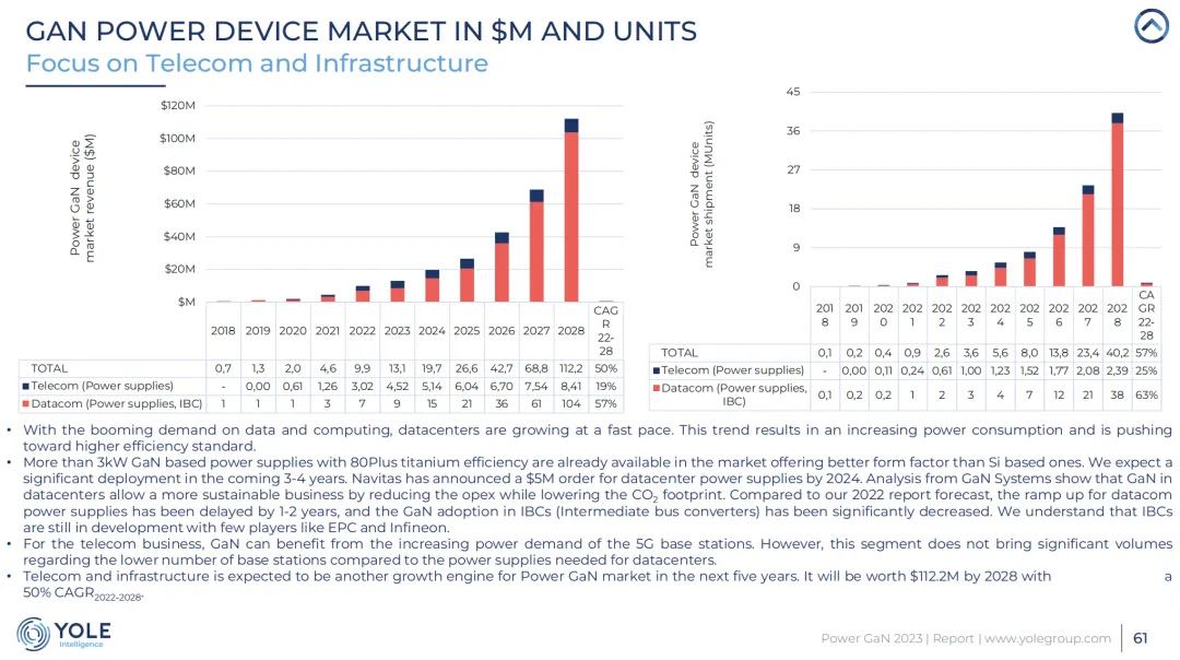 3、在电信和基础设施市场中,随着数据流量的激增和5G技术的推广,电信基础设施对高效电源的需求也在增长,Power GaN技术在数据中心和电信基站的电源管理系统中提供了高效率和高功率密度的解决方案。预计到2028年,市场价值将达到1.122亿美元,显示出2022年至2028年间50%的复合年增长率。这一增长受到超过3 kW的GaN基电源供应和正在开发的中间总线转换器(IBCs)的推动。
