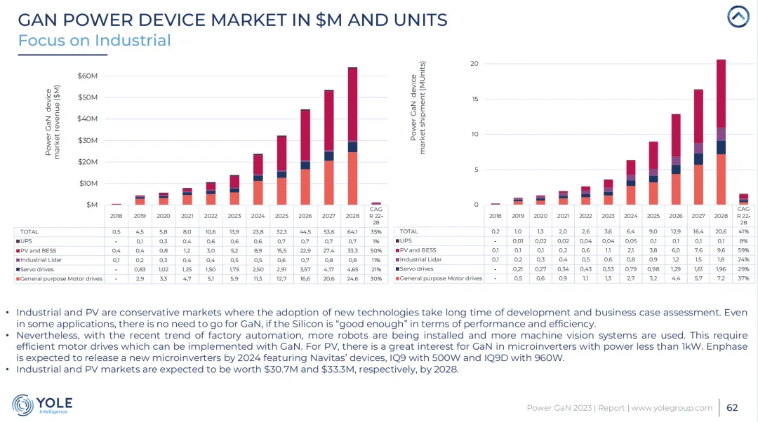 4、在工业领域,Power GaN技术被用于电机驱动、工业电源和可再生能源系统,如太阳能光伏和储能系统。这些应用需要高效率和高可靠性的电力转换,Power GaN技术满足了这些要求。预计到2028年将达到3.033亿美元,显示出2022年至2028年间50%的复合年增长率。这一市场的增长受到工厂自动化和光伏(PV)应用中对高效电机驱动和电源转换需求的推动。